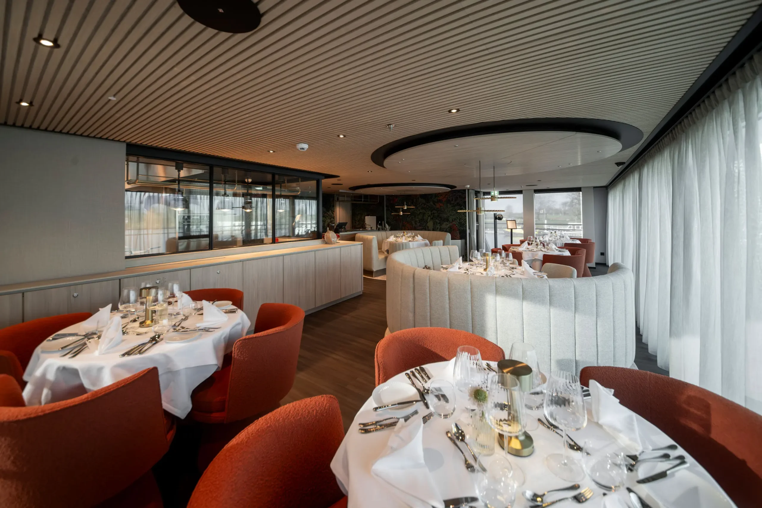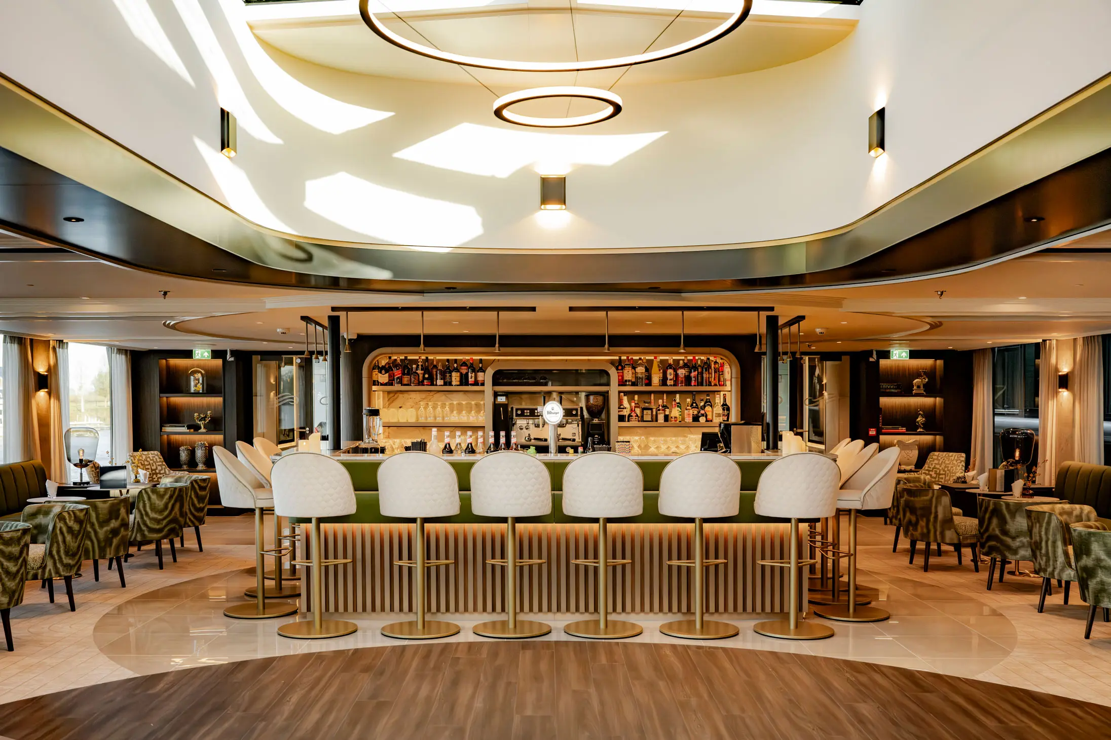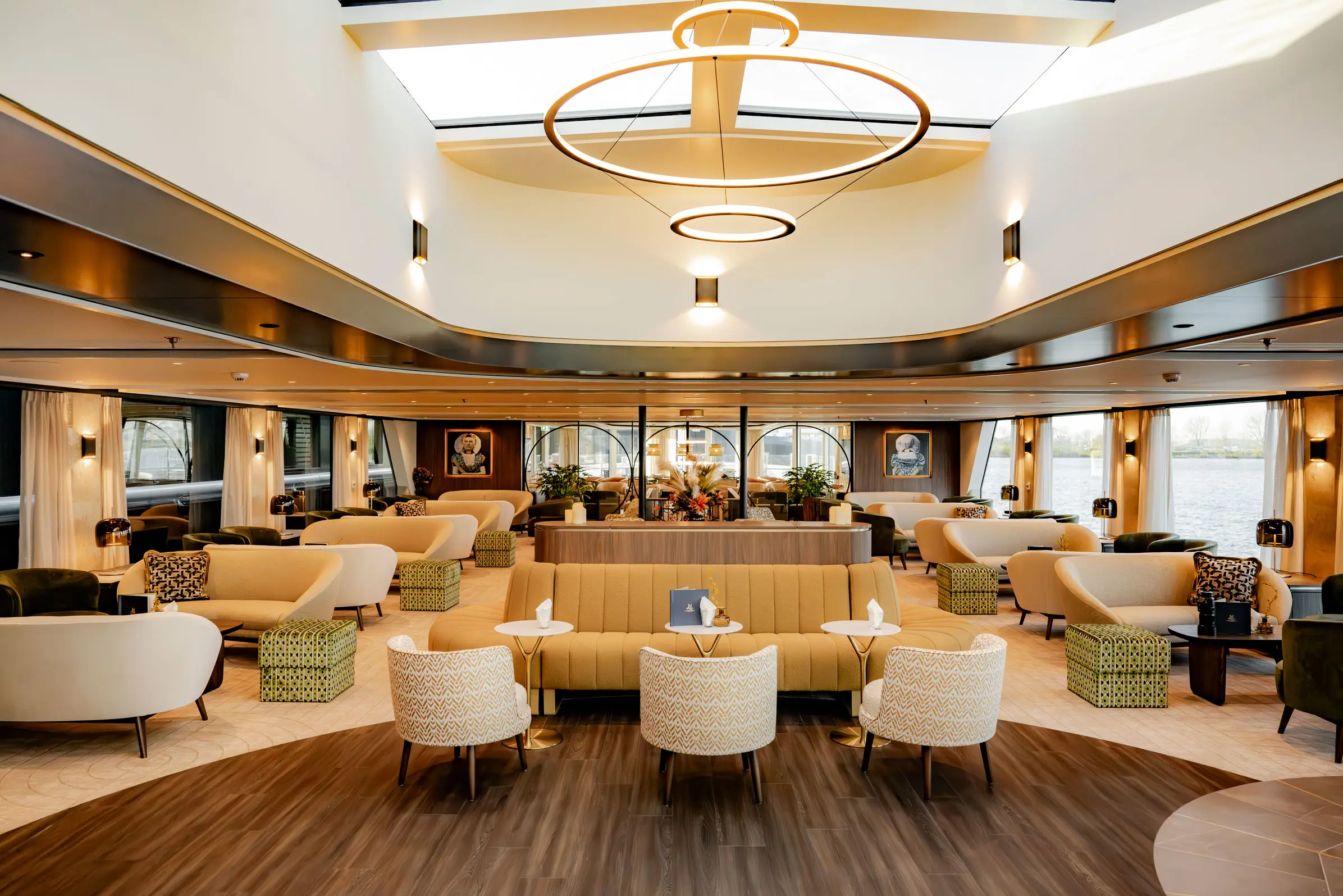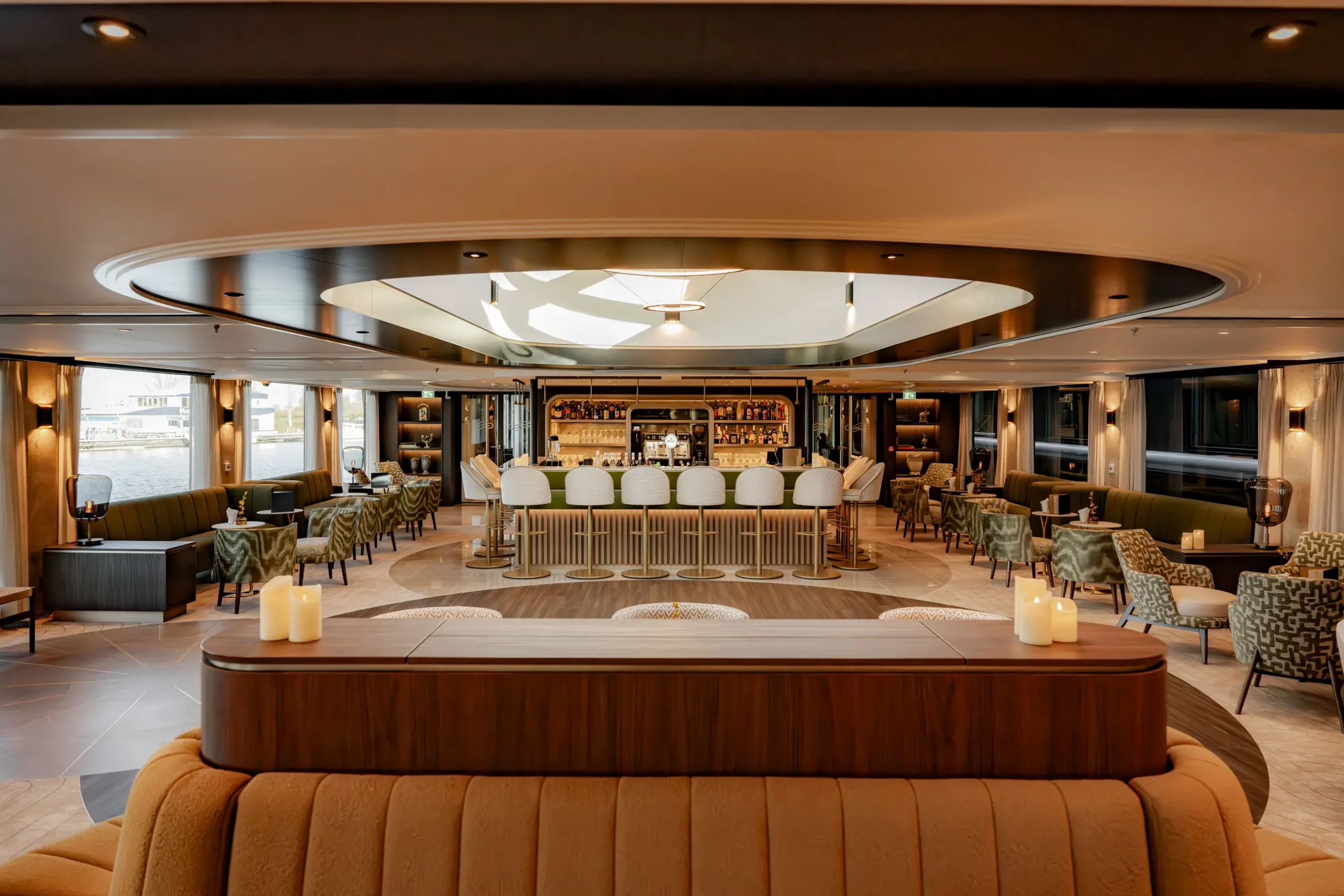 The Majesty Lounge & Bar is the heart of life aboard The Nobleman. This inviting observation lounge features expansive windows that frame ever-changing river views, comfortable seating designed for relaxation and conversation, and attentive bar service throughout the day. It is the perfect place to gather for a morning coffee, enjoy an afternoon drink, or unwind in the evening while watching the scenery glide by.